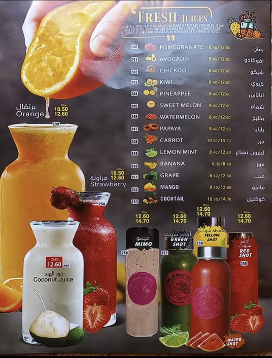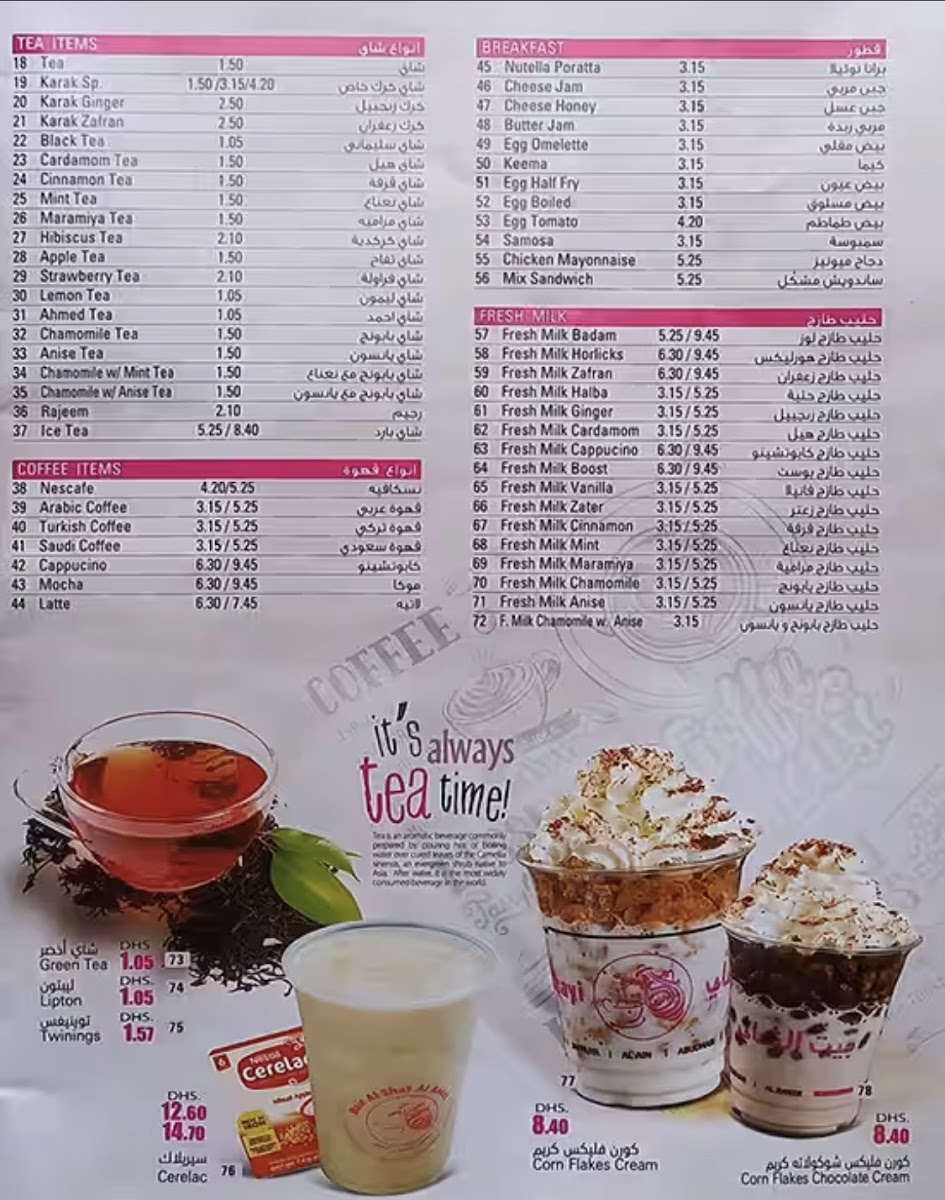At Bait Al Shay Al Aseel Cafeteria Menu, you'll find a delicious mix of traditional and contemporary dishes that cater to every taste. Located in the heart of Al Rashidiya, Dubai, this cafeteria is a local favorite for both quick bites and satisfying meals. Whether you're in the mood for a refreshing drink, a hearty sandwich, or a warm bowl of traditional Arabic food, there's something here for everyone. The menu highlights freshly prepared options using the finest ingredients, perfect for a casual meal with friends or a quick stop on the go. From flavorful shawarma to vibrant salads, every dish promises a unique experience that will keep you coming back for more. Make sure to try their signature drinks that pair perfectly with any meal, offering a refreshing twist to your dining experience. Whatever you're craving, Bait Al Shay Al Aseel Cafeteria Menu has got you covered.